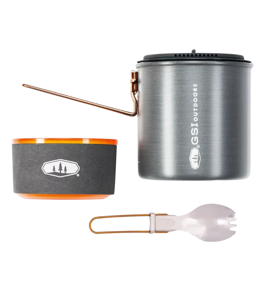 The GSI Outdoors cooking set features a crushproof, heat-resistant nylon lid with an integrated strainer that doubles as a Sip-It lid for your mug.